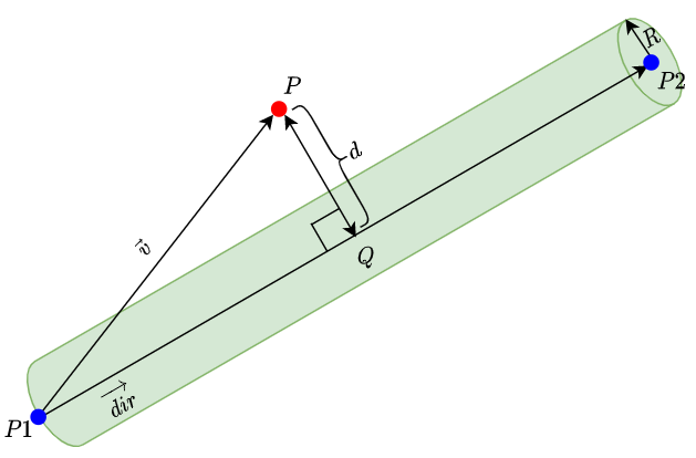 \[\begin{align} P1 &= \text {실린더 시작점}\\ P2 &= \text {실린더 끝점}\\ R &= \text {실린더 반경}\\ dir &= \frac{\overrightarrow{P1 \to P2}}{|\overrightarrow{P1 \to P2}|} \quad \text{(}\overrightarrow{dir}\text{은 단위 벡터)}\\ v &= \overrightarrow{P1 \to P}\\ t &= \overrightarrow{dir} \cdot \vec{v} \quad \text{(t는 벡터의 내적 값)}\\ &=\begin{cases} t \ge 0 \text{ and } t \le |\overrightarrow{P1 \to P2}| \quad &\therefore \text{점 P는 실린더 시작점과 끝점 사이에 있음 }\\ otherwise \quad &\therefore \text{점 P는 실린더 외부에 존재} \end{cases} \end{align}\]점 P가 실린더의 시작점과 끝점 사이에 있다는 것을 알았다면