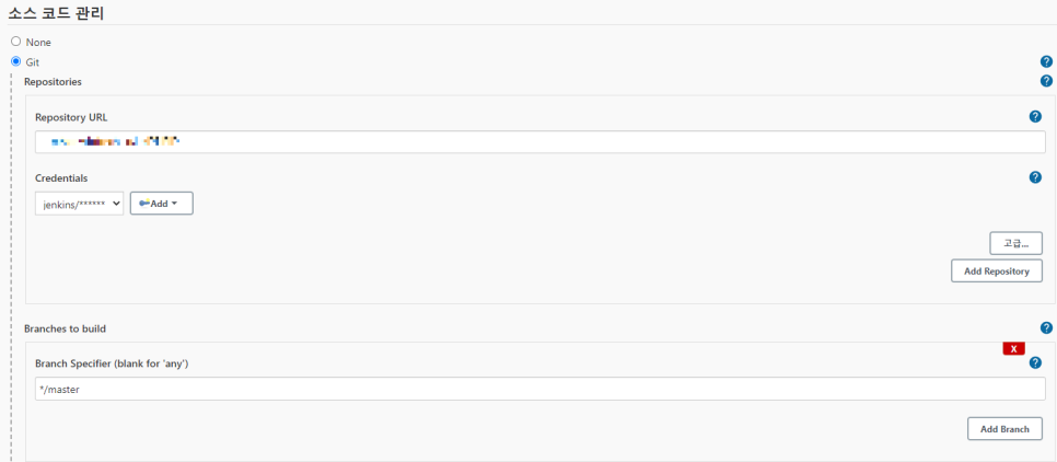 2.2 [Job 구성] 소스를 받기위해 소스 저장소 정보를 입력합니다.