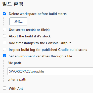 2.3 빌드 환경을 설정합니다. 빌드할때마다 Workspace를 삭제하고 환경 변수를 설정할 파일 경로를 입력합니다.