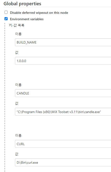 환경 변수 파일에 BUILD_NAME를 저장하면 환경 변수가 변경이 되고 이후에 설명할 Email template 파일에서 BUILD_NAME을 읽어서 메일에 버전을 표시하게 됩니다. 따라서 BUILD_NAME은 Global properties에 등록이 되어 있어야 합니다.