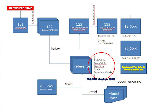 PDS 3D 모델을 이용해서 2D 도면 생성 로직 Posted Jul 5, 2011 By humkyung 1 min readPDS 3D 모델을 이용해서 2D 도면 생성 로직을 간단하게 FLOW CHART형식으로 표현해 보았습니다. 여기서 2D DWG FILE NAME은 PDS에서 작성한 HIDDEN 도면을 말하는 겁니다. 그리고 121,122,123,113은 PDS에서 사용하는 테이블 이름을 의미합니다. USTN MDL PDS Share