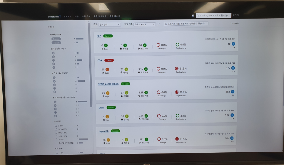 검사 결과는 SonarQube 대시보드에서 확인할 수 있습니다. 회사 사람들 모두가 볼수 있도록 입구 TV 같은 곳에 켜놓으면 프로젝트 상황을 볼수 있어 더욱 효과적일것 같습니다.