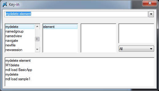 실행은 MSTN의 Key-in UI에서 ‘MYDELETE ELEMENT’ 입력을 하면 이것과 연결된 Command가 실행이 됩니다.